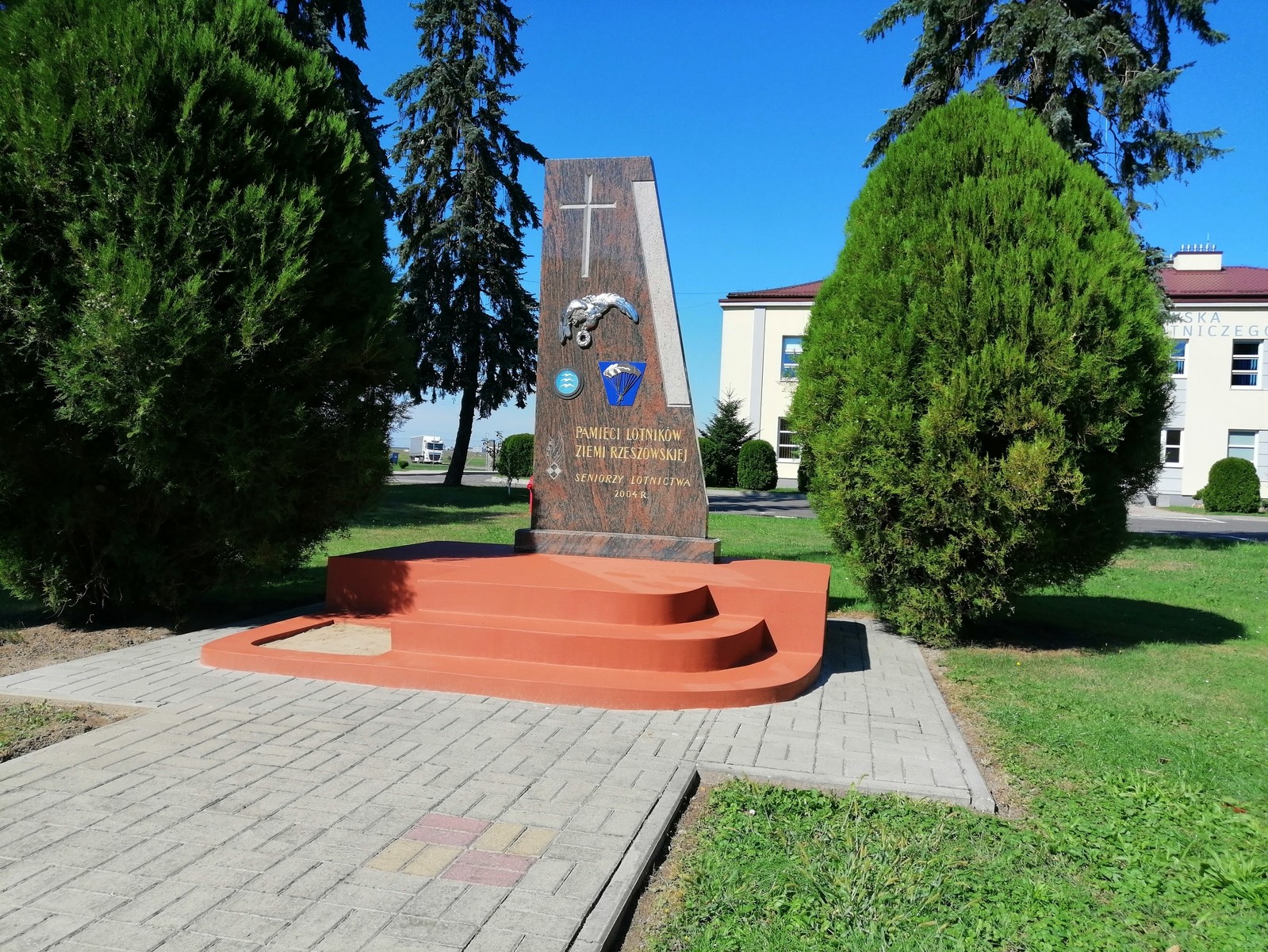 Ten niepozorny pomnik widzi każdy kto wjeżdża na teren OKL-u. Widzi, ale czy docenia? Jego historia jest naprawdę interesująca. Obecnie jest to granitowy obelisk na podmurówce. W nieco zmienionej formie stoi tu już prawie ćwierć wieku. Widnieje na nim napis: PAMIĘCI LOTNIKÓW ZIEMI RZESZOWSKIEJ. Na pierwszym planie znajduje się gapa – odznaka pilota wojskowego z orłem z rozpiętymi skrzydłami trzymającym w dziobie wieniec laurowy i krzyż, niżej – logo Klubu Seniorów Lotnictwa czyli uskrzydlona, lotnicza szachownica, odznaka szybowcowa z trzema białymi mewkami na niebieskim tle oraz cywilna odznaka spadochronowa. W dolnej części – adnotacja: SENIORZY LOTNICTWA, 2004 R.